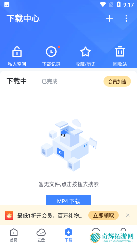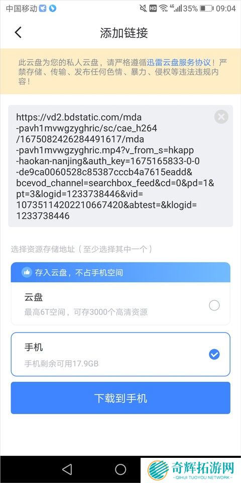 3、在打开的新页面中将链接复制进去点击下载即可,如需下载到云盘,可切换存储空间为云盘即可。