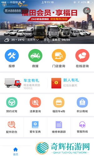 1、进入福田e家app之后,我们就能在【爱车】页面看到一些常用的功能入口,如预约维保、紧急救援、门店查询等。
