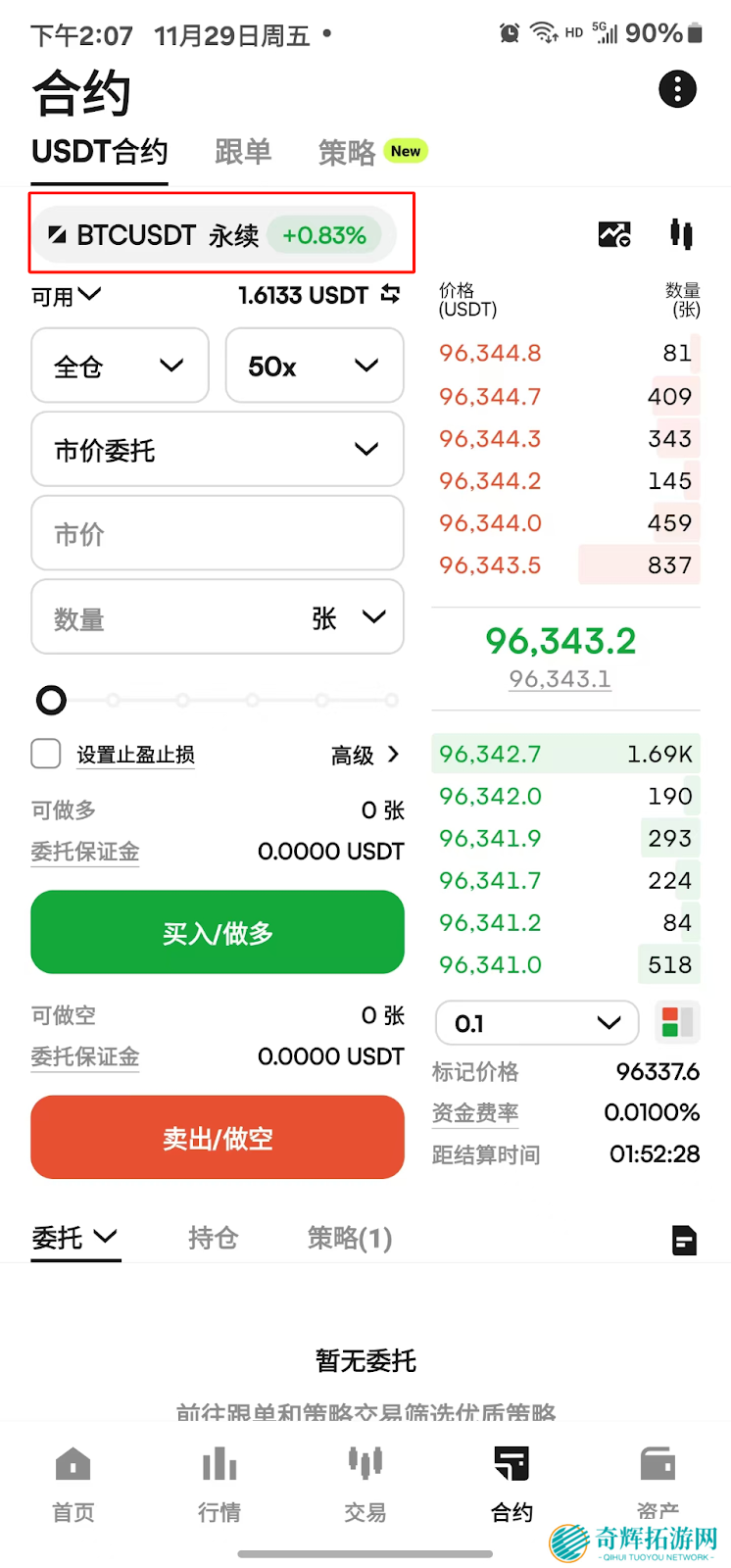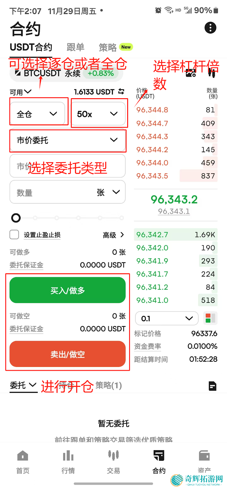 注意:在进行合约交易之前,请将USDT从资产账户划转至合约账户。