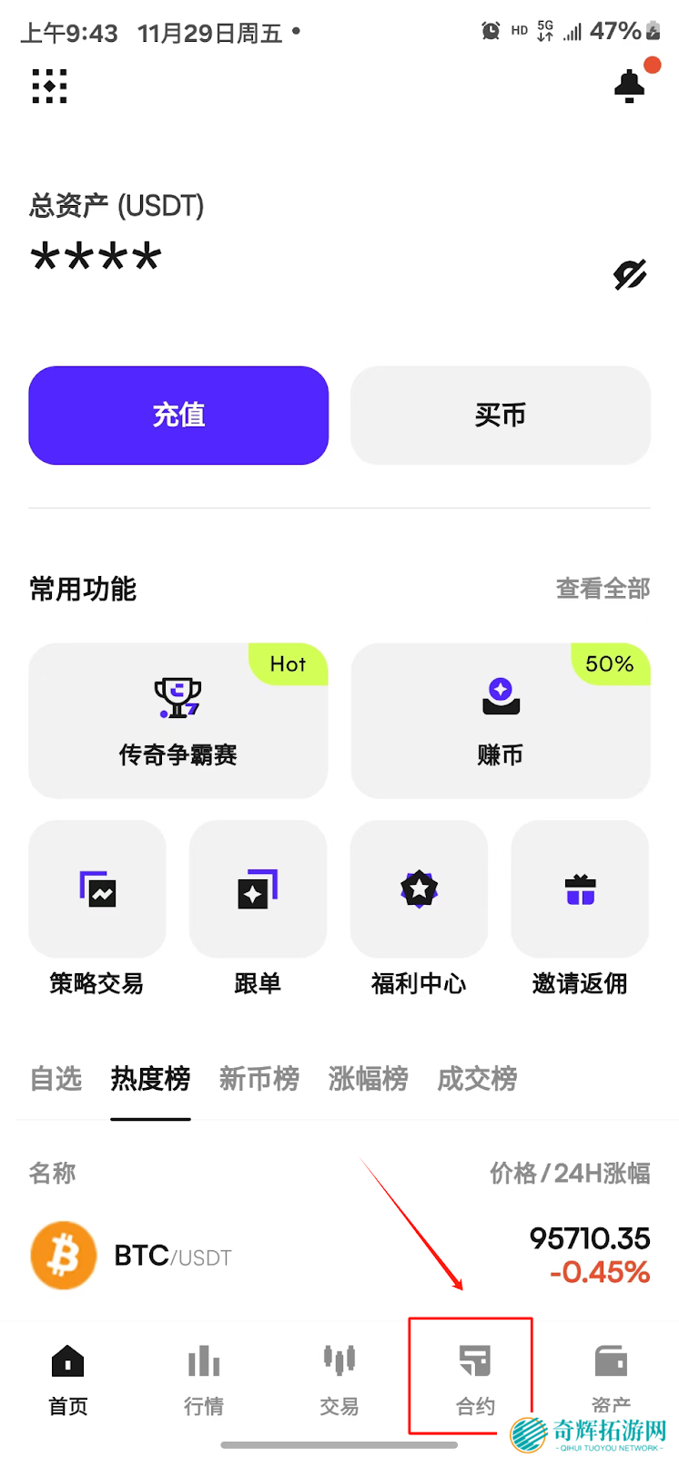 1、登录进入币赢正版app,点击下方导航栏“合约”按钮进入合约交易界面。