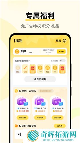 5、点开【福利】,玩家可以签到领金币、然后可以用金币兑换免广告的特权,让你玩游戏更加轻松。