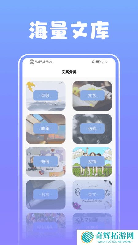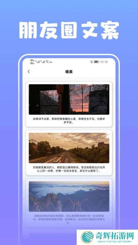 1、一款拥有优质文案内容的软件,唯美的句子不仅可以治愈心灵还给好友带来温暖。
