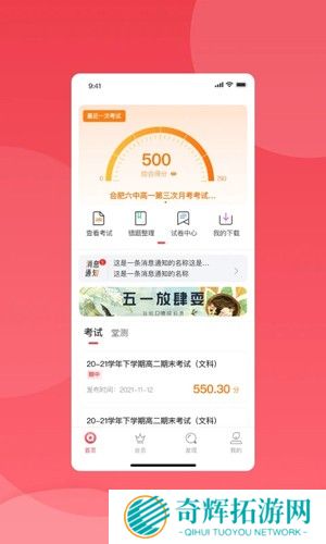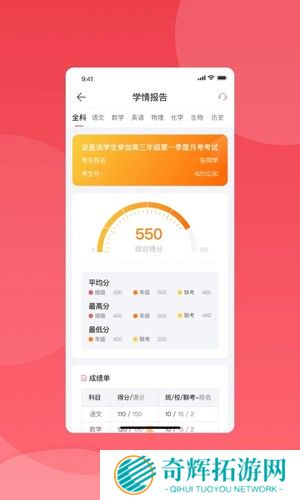 2、查看考试成绩,还会结合历史成绩分析偏科、错题数据,帮助学生明确学习方向。