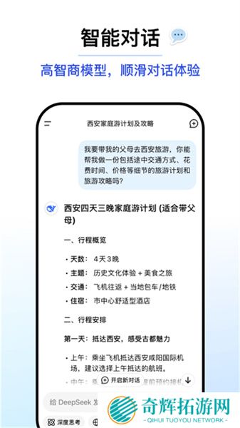 deepseek移动端是一款基于人工智能系统的智能问答、智能对话、智能写作功能的软件。软件提供了上述的几个主要功能,并且所有的功能都是完全免费的,你可以输入自己的问题,智能的ai会根据全网的信息结果,为你做出准确而迅速地解答。这个过程省去了用户自己进行百度查找、并且对搜索结果的信息进行过滤、筛选的时间,从而大大提高了用户的学习、工作的效率。