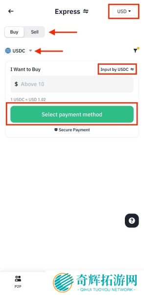 2. 切换至快捷区后,选择要交易的法币。然后,选择【买入】或【卖出】,再选择要交易的加密货币。点击【输入“加密货币”】或【输入“法币”】,输入要交易的法币或加密货币数量。