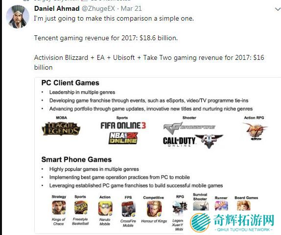 2017年腾讯有很多游戏备受欢迎,无论是之前火了7年的LOL还是爆款手游《王者荣耀》都是大家非常喜欢的游戏。在2017年里腾讯的游戏收获了很多的利润,这个利润的总值居然比国外四大游戏公司2017年的总和还多,这让人有点难以相信,但事实就是如此这个消息还是teamSpy创始人推特中提到的。
