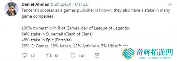 从大局而言,腾讯的投资和代理非常的官方,在2018年初又开始进行新一轮的计划了,比如在直播平台上进行了多个投资,在斗鱼和虎牙两大平台上就花了69亿,前段时间又买了育碧部分股份,而在国外大火的《堡垒之夜》开发商Epic也在2012年被腾讯收购,再加上获得《绝地求生》国内代理权,不知道2018年还会掀起多大的浪潮呢?
