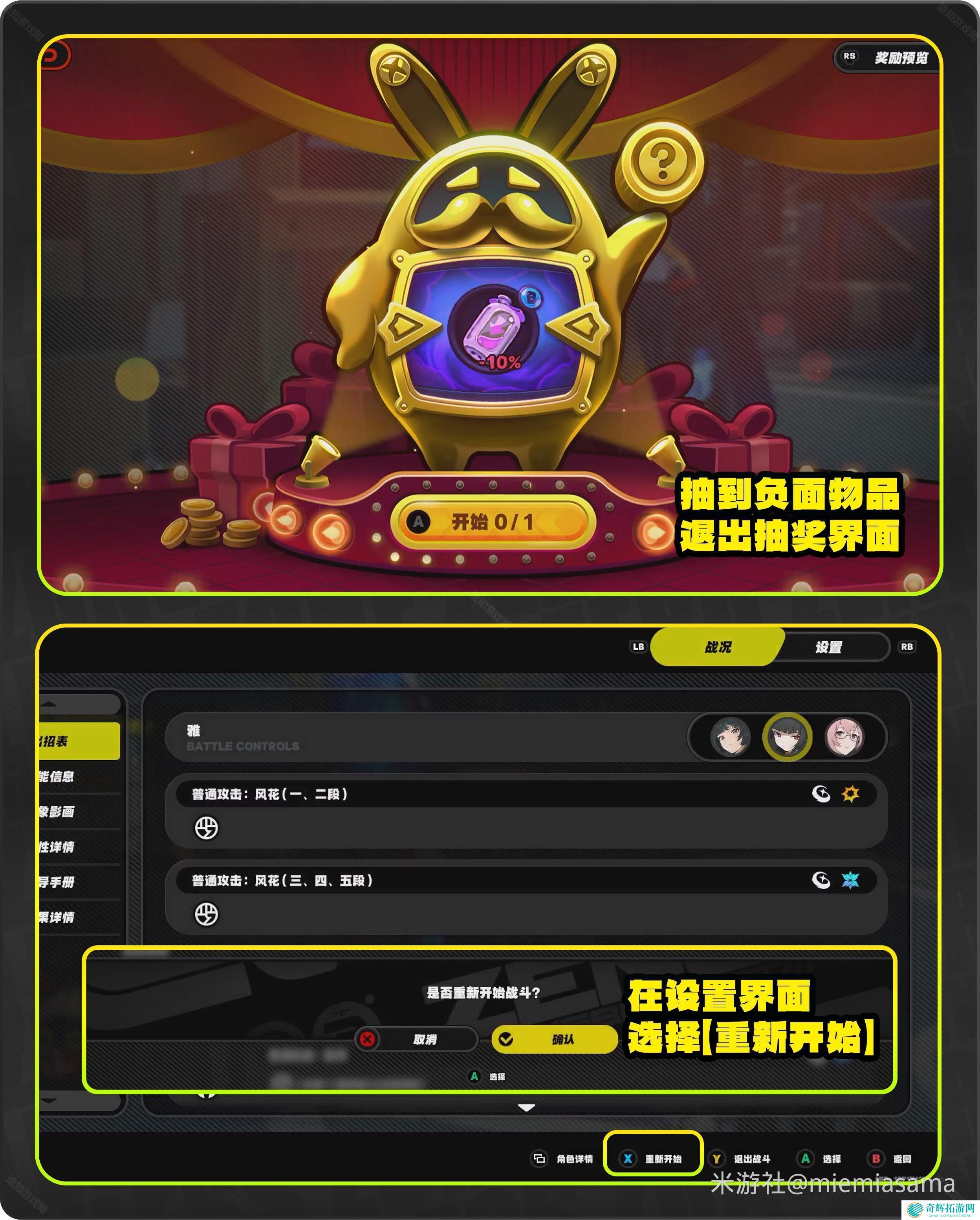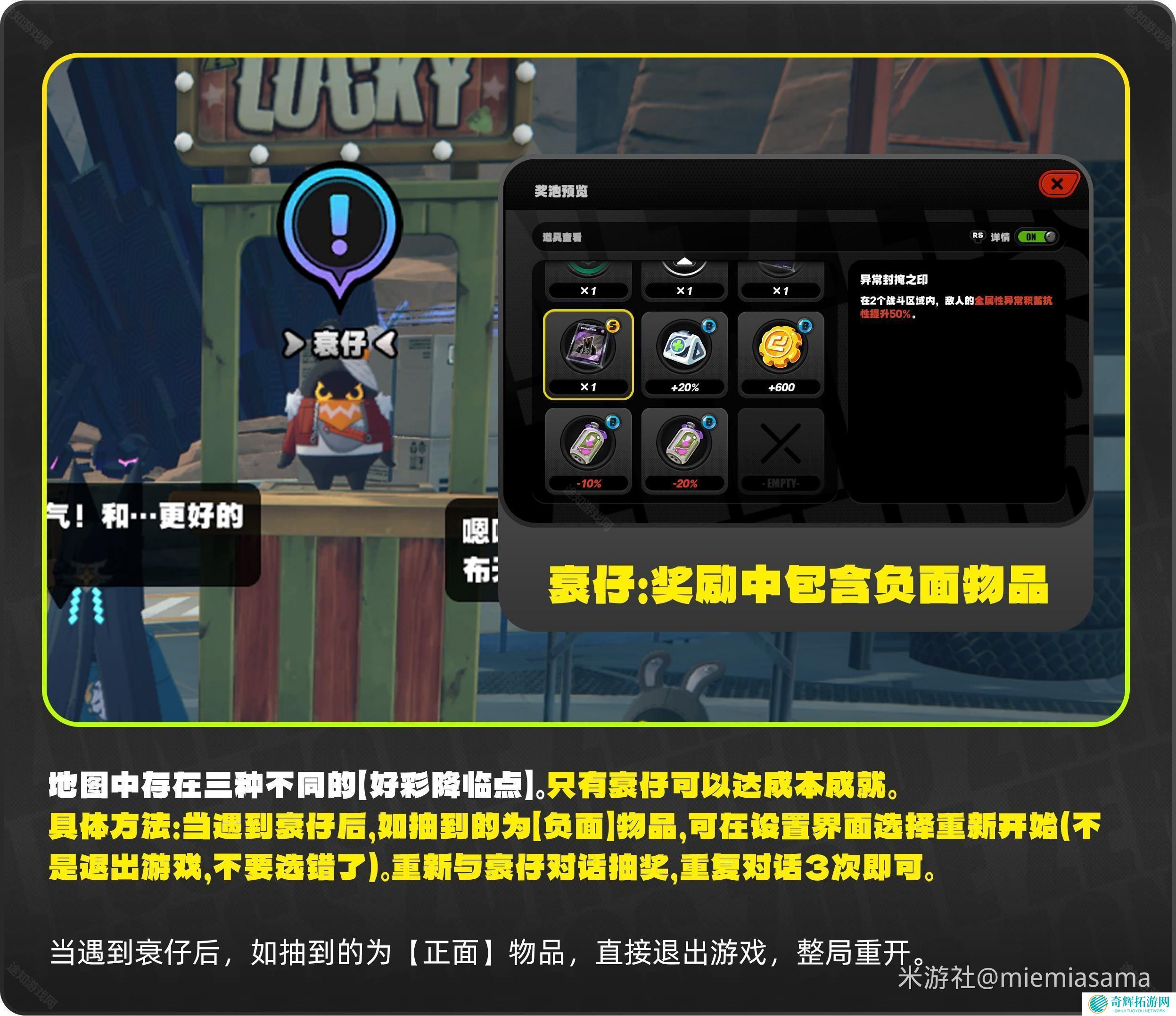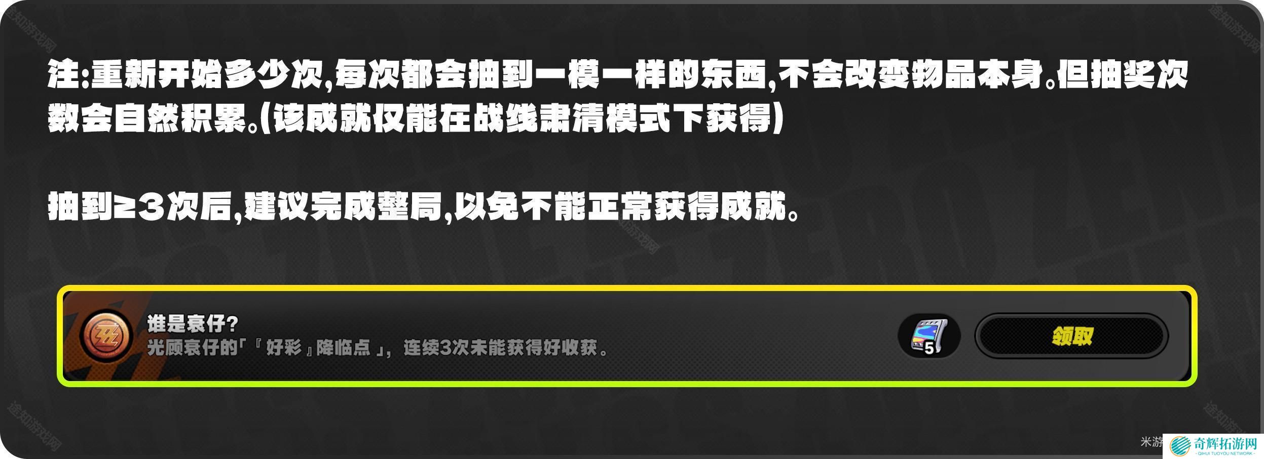 当遇到衰仔后,如果抽到的是负面物品,我们可以在设置界面选择重新开始,重新与哀仔对话抽奖,重复对话3次,连续抽中3次好东西即可达成成就。