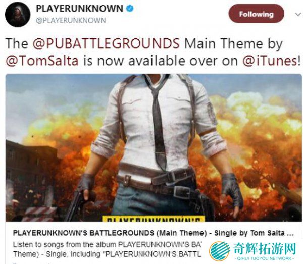 这个消息还是《绝地求生》制作人布伦丹格林在个人推特上分享的,《绝地求生》主题曲单曲已经上架苹果iTunes,这首曲子由Tom Salta制作,售价0.99美元。