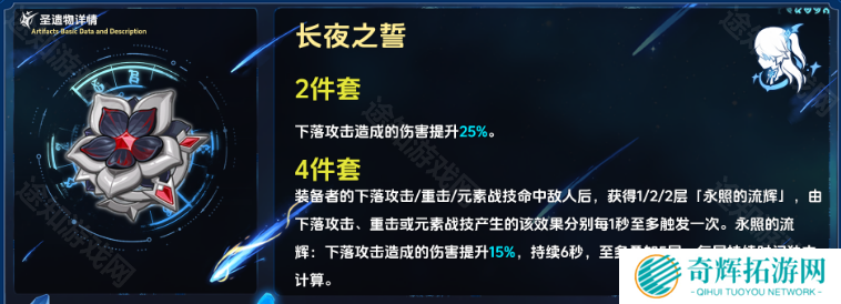 长夜之誓2件套提供25%的下落增伤,4件套满层提供70%的下落增伤,共计提供100%的下落增伤加成,单就圣遗物的面板来说,强度相当不错。