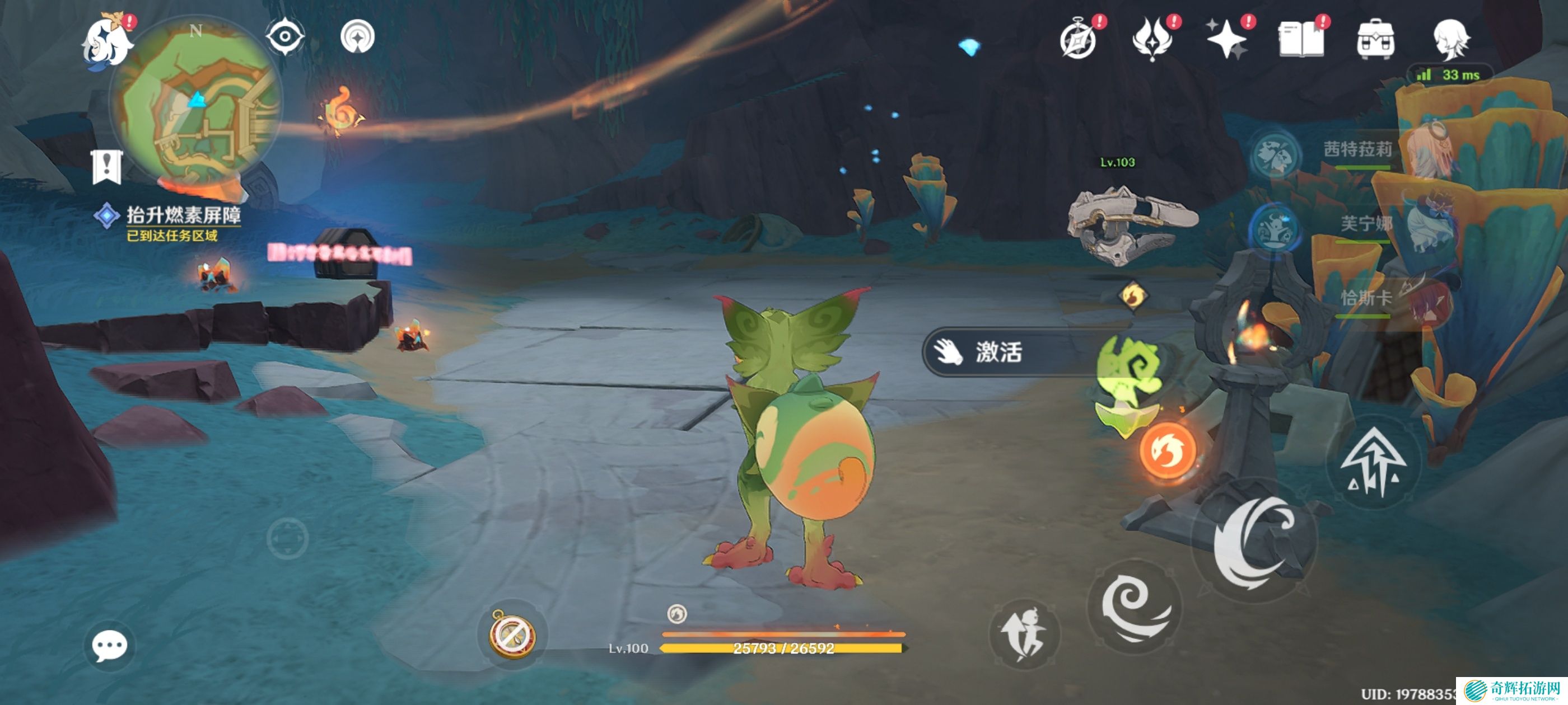消灭机关周围的敌人,获得精致宝箱*1,附身鳍游龙通过灵道前往高处,进入燃素池充能