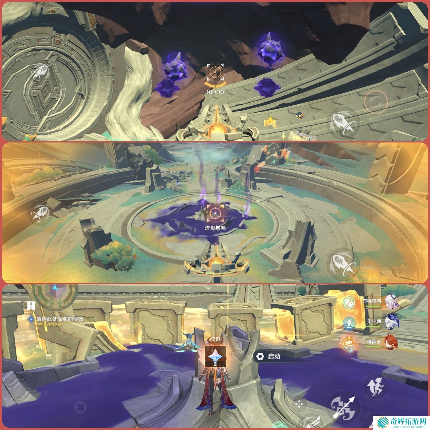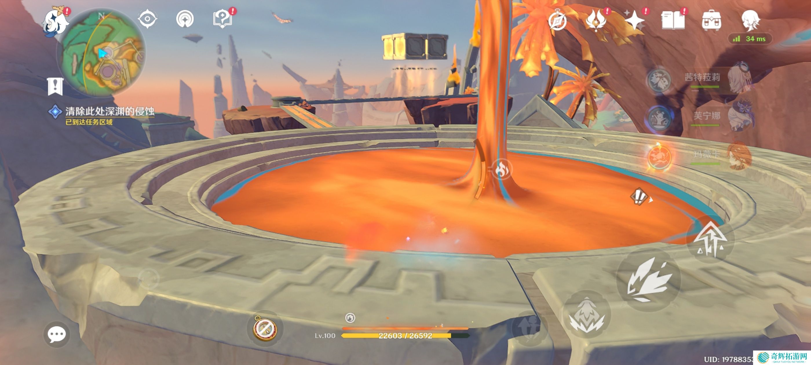 继续前进,清除路上的淤泥悬核,获得精致宝箱*1,解锁锚点,前方火神瞳*1,来到中央平台,清除周围深渊侵蚀,激活机关