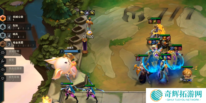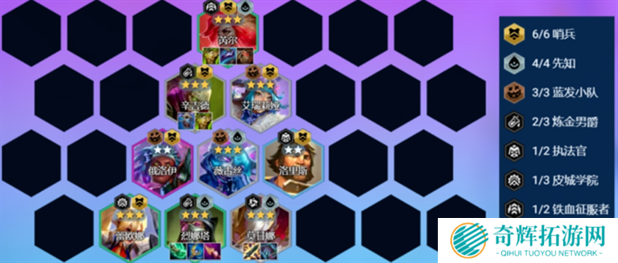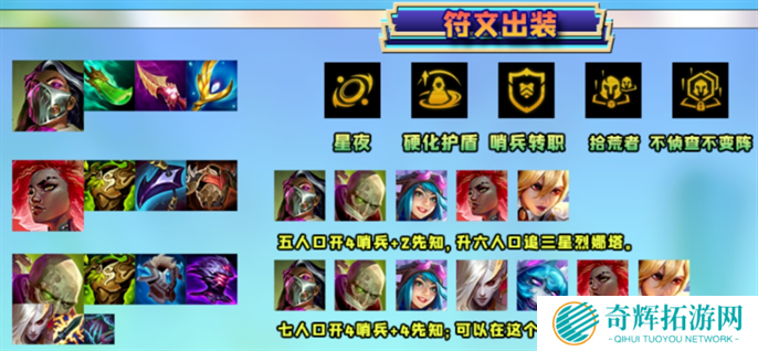 六人口慢搜三星哨兵牌和三星烈娜塔,追到质量差不多时可以升七人口开4哨兵+4先知。这个玩法前中期一定要保证血量健康,后期上限不高,都是凭高血量吃分,登顶的话需要看运气。