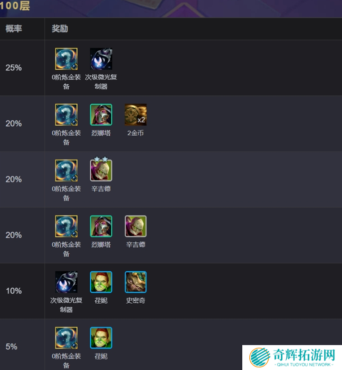2-1不升人口,用莫甘娜搭配芮尔,能换怪即可,有3炼金直接上,2-5之前三炼金可以贪100层,100层奖励除了最后一个都不错。