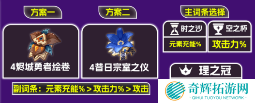 一般情况下,首推4烬城勇者绘卷,如果队伍中已有角色携带4勇者,可考虑昔日宗室之仪4件套