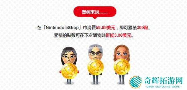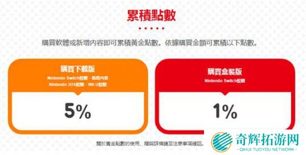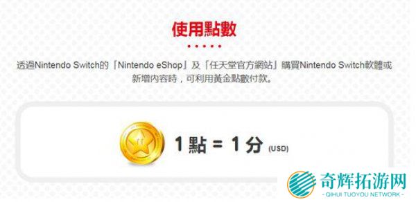 即日起,通过Switch的eShop商店及“任天堂官方网站”购买Switch游戏或是DLC等新增内容,将可使用黄金点数付款。其中,每100点黄金点数可折抵1美元。