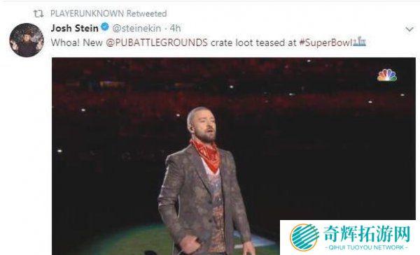 2月5日下午,微软Xbox 社区产品经理Josh Stein 在推特发布了一张超级碗现场照片,展示了《绝地求生》战利品新服装。这才是史诗级的战利品,该服装一出场就引爆了现场气氛,随后Josh Stei