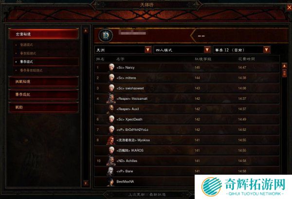 2月10日,暗黑3全球四大服务器喜迎一波超大的封号浪潮,在赛季结束之际,暴雪清洗了所有天梯榜单的环境,同时也造成了一些非常尴尬的局面。上图为美服的四人榜,可以看到前面的8支队伍主力输出(法师、死灵法师