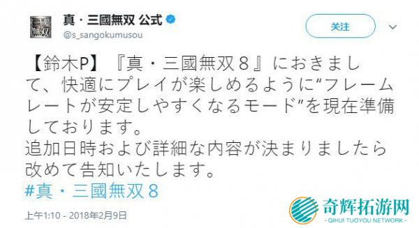 针对《真·三国无双8》发售以来饱受批评的掉帧问题,《真·三国无双》官方推特刚刚表示,光荣将针对游戏的帧数问题,推出一个全新的画面模式,以此改善游戏的帧数表现。自游戏在2月8
