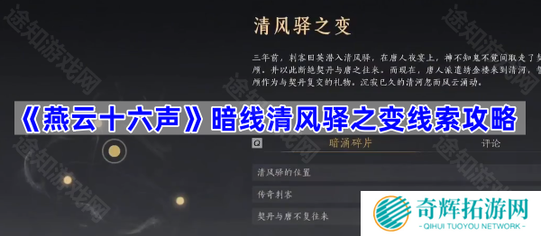 燕云十六声清风驿之变怎么收集?燕云十六声是一款开放世界的武侠游戏,我们可以通过收集故事线索来达成故事成就,有许多小伙伴还没有完成明暗故事暗线清风驿之变的线索收集,途知小编为大家整理了线索攻略,我们一起