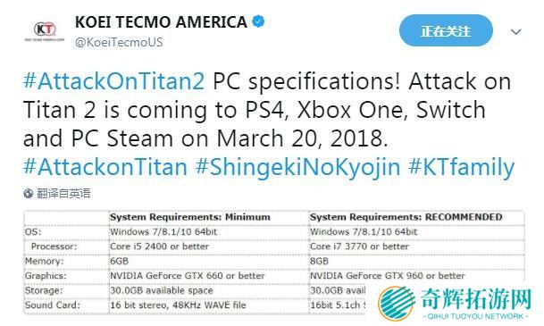 2月23日消息,光荣特库摩游戏官方在推特上公布了《进击的巨人2》PC版配置要求,可以看到推荐配置也只需要8G内存和GTX960显卡,对比动则1060以上的游戏来说,这个配置还是非常亲民的。最低配置要求