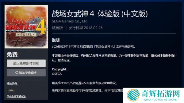 PSN港服商店今日上架了《战场女武神4》的中文体验版,大小为5 33G。试玩地址:点击进入虽然港服官方没有在商店页面给出试玩版的说明,但根据日服商店信息显示,这个体验版可以游玩至第2章结束,并且存档可