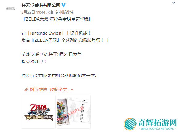 据任天堂香港有限公司官方微博透露《塞尔达无双》将于3月22日登陆Switch,并且支持中文!游戏已经接受预购,原作行货首批更有机会获赠笔记本,对于国内塞尔达粉丝来说这真是一个好消息。官方微博:官方原文