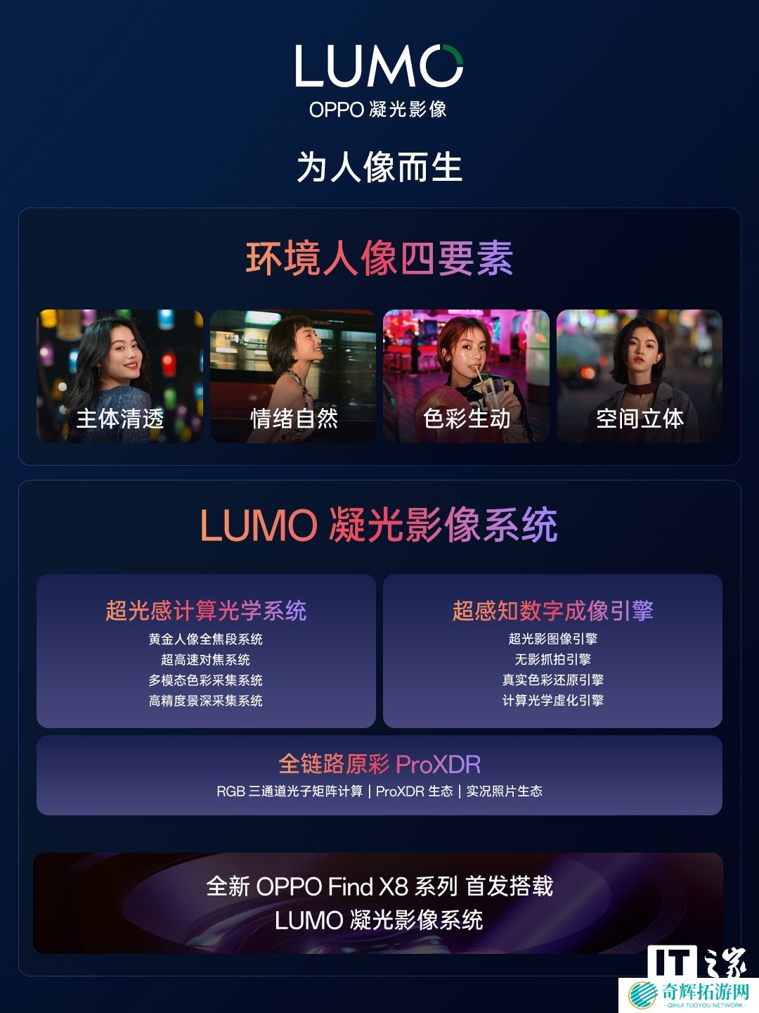 据本站此前报道,OPPO 在本月(4 月 2 日)的 OPPO 影像科技之夜现场,宣布推出全新的影像品牌“LUMO 凝光影像”,号称为人像而生。OPPO Find X8 系列机型都将 OTA 推送 LUMO 凝光影像系统。
