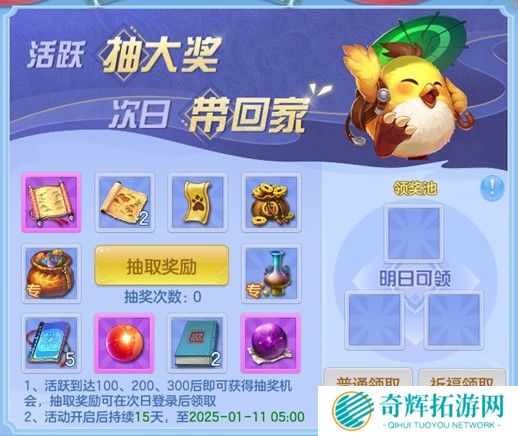 每日活跃可获得三次抽奖机会,祈福抽签更有机会获得双倍道具!