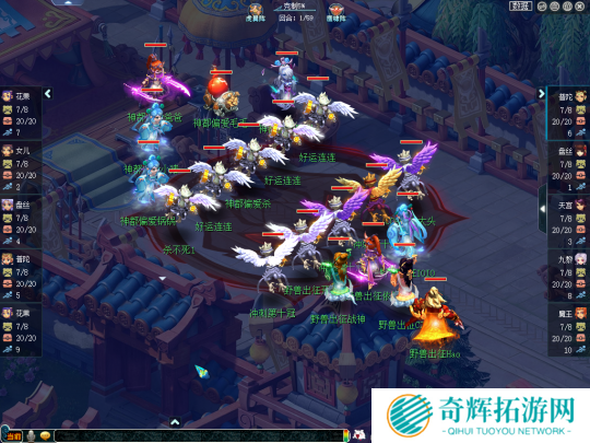 进入比赛后,野兽出征采用了普陀、盘丝、天宫、九黎、魔王组成的“双封双秒”阵容,神都偏爱采用了花果、女儿、盘丝、普陀、花果组成的“双封点杀”阵容。就阵容体系来说,野兽出征的输出能力要比神都偏爱高上不少。
