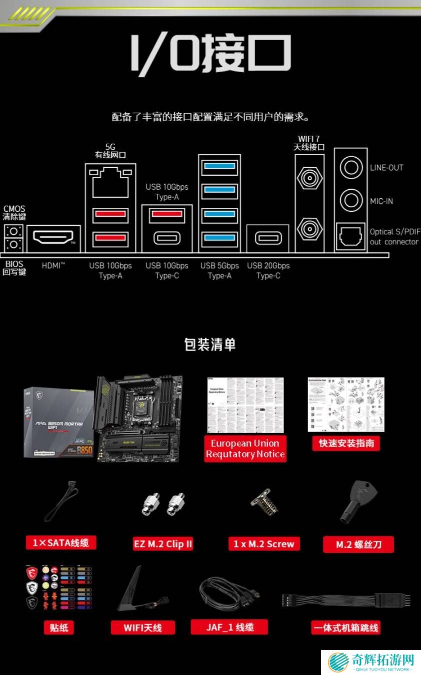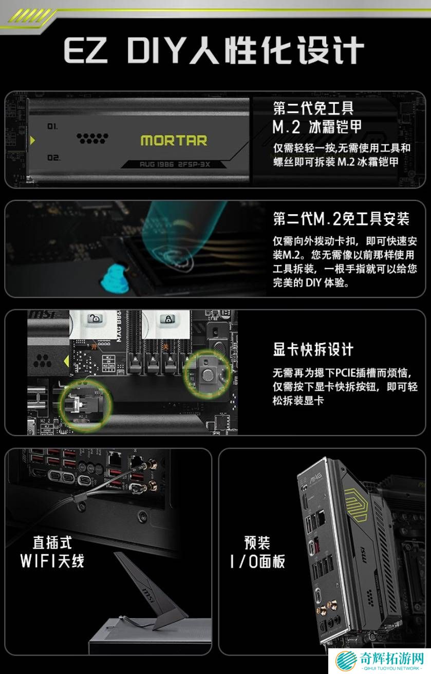在细节方面,MAG B850M MORTAR WIFI迫击炮同样考虑周到。固态硬盘位置和硬盘安装位均升级为免工具安装,显卡安装也变得更加简便。IO接口部分则提供了丰富的选项,包括HDMI、多个USB接口、网口、光纤音频接口等,能够满足大部分玩家的外接需求。