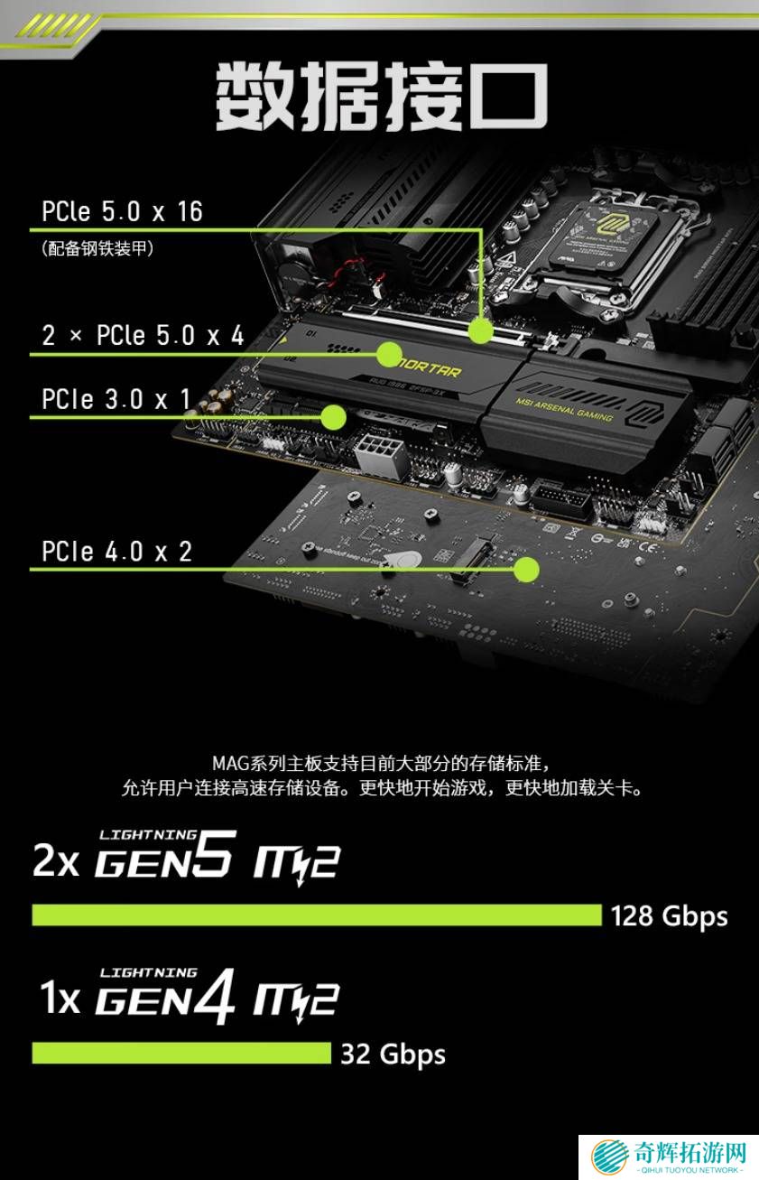 在扩展性方面,MAG B850M MORTAR WIFI迫击炮同样表现出色。它配备了三个M.2固态接口,其中两个支持PCIe 5.0×4速率,一个支持PCIe 4.0×2速率,能够满足玩家对高速存储的需求。主板还提供了一条PCIe 5.0×16插槽和一条PCIe 4.0×1插槽,为未来的高性能扩展预留了充足空间。
