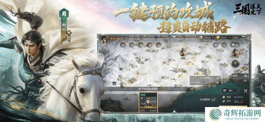 传统SLG游戏中的繁琐操作,如铺路、攻城战等,往往让玩家望而生畏。《三国:谋定天下》则通过引入自动铺路功能,一键预约攻城等创新玩法,极大地减轻了玩家的操作负担。玩家只需设定好目标,系统便能自动规划最优路线,执行攻城任务,让玩家在忙碌的工作中也能轻松享受游戏的乐趣。