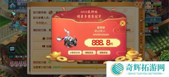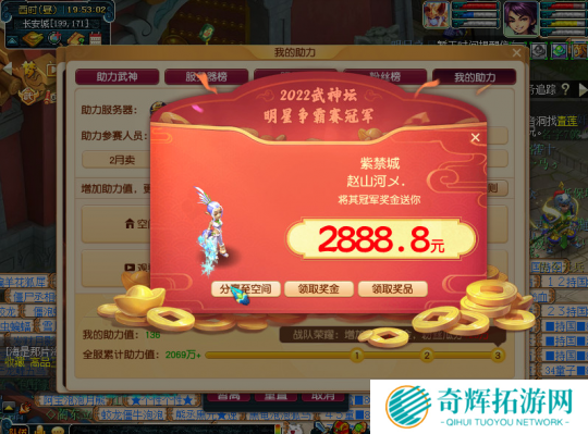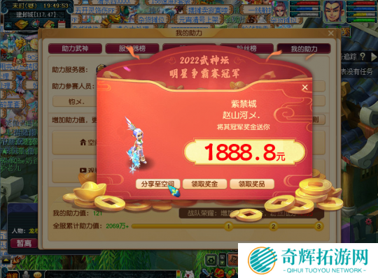 2022武神坛全明星争霸赛由紫禁城夺冠,紫禁城夺冠之后,支持紫禁城的粉丝玩家笑逐颜开,兴高采烈,争相上线领取属于自己的惊喜。888、1888、2888等高额奖励在这个冬天让粉丝玩家们倍感暖意。