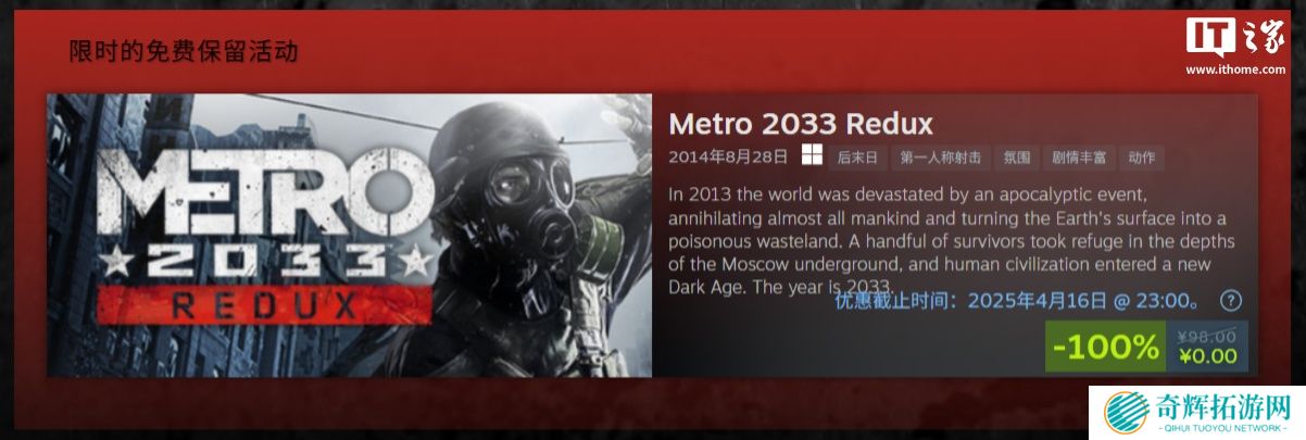 本站 4 月 15 日消息,为庆祝《地铁》系列游戏 15 周年,Steam / GOG 商店现可免费领取《地铁 2033 复刻版》(Metro 2033 Redux),限时 48 小时。