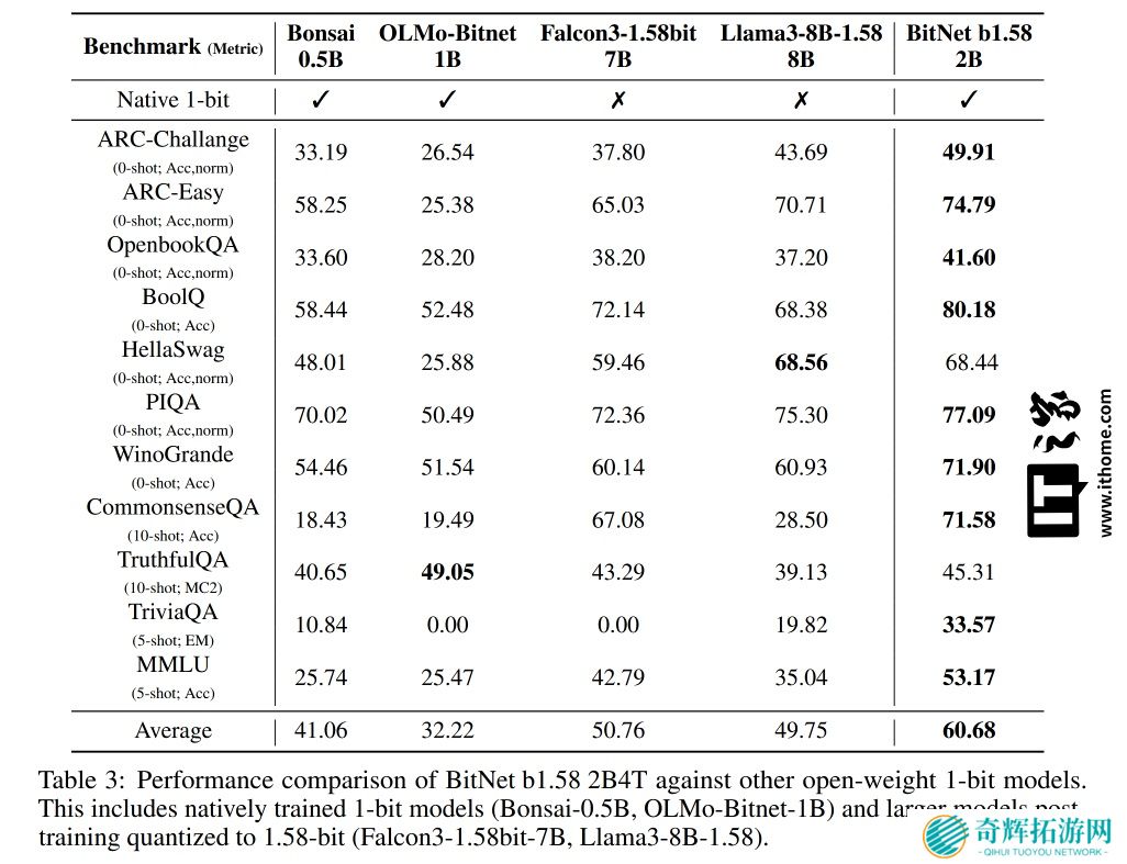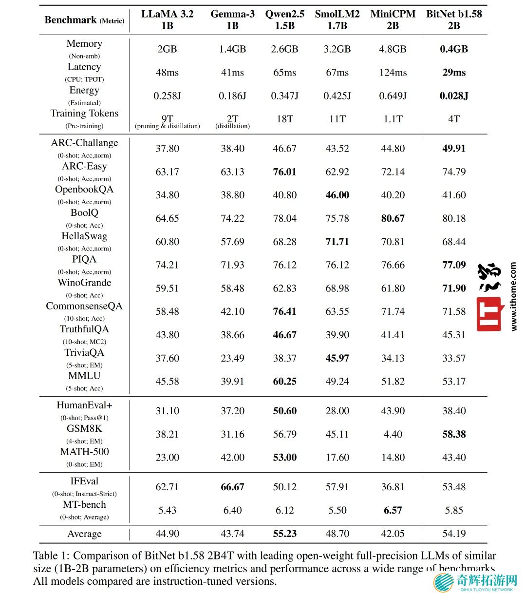 本站援引技术报告介绍,该模型性能直追同规模全精度模型,但计算资源需求大幅缩减。尤其令人瞩目的是,其非嵌入内存占用仅 0.4GB,远低于竞品 Gemma-3 1B 的 1.4GB 和 MiniCPM 2B 的 4.8GB。
