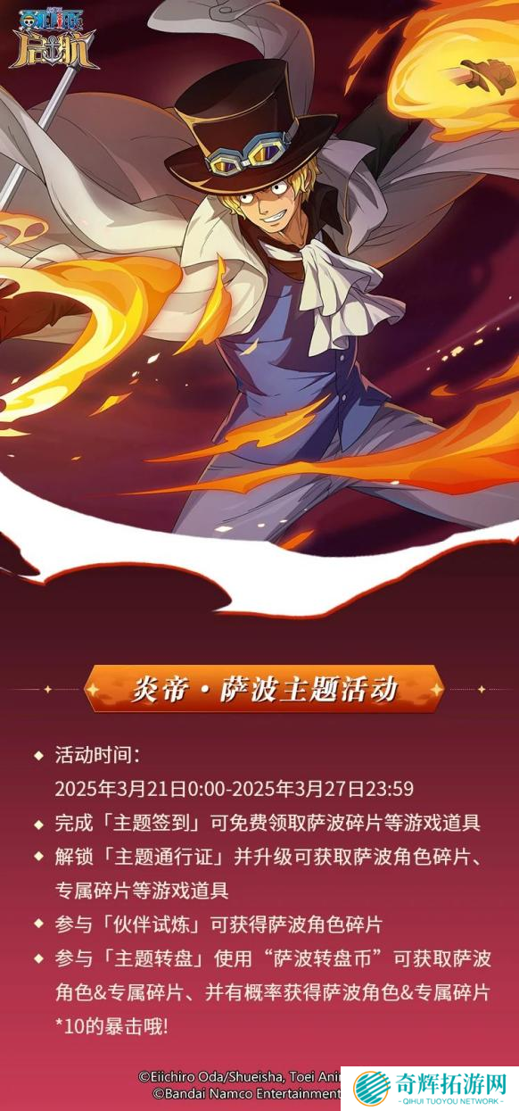 炎帝·萨波伙伴定位为中排·火系·控制·治疗。炎帝·萨波自身的能量获取不会被无效化,且治疗量与治疗效率均不受外界影响;入场后对自身以外的队友施加【星火】,持续60秒;为处于【星火】状态的队友分担10%伤害;场上每有存在1个【星火】,炎帝·萨波将获得15%绝对减伤;若入场后我方伙伴均带火系标签或触发【三兄弟】,处于【星火】状态的队友受到的暴击伤害减少20%。推荐阵容:和之国大妈、烬、炎帝·萨波、火拳·艾斯、凯多。顺带一提,火拳·艾斯也迎来了全新突破,潜能之力正式开放,焰火燃烧得更加炽烈,战斗力再攀巅峰!即日起至3月27日,参与活动即可获取大量好礼哦!