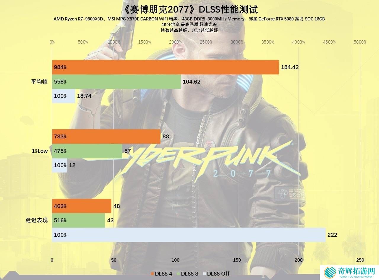 在实际游戏测试中,微星GeForce RTX 5080超龙SOC显卡同样表现出色。在《赛博朋克2077》中,开启DLSS 4后,游戏帧数从18.74 FPS提升至184.42 FPS,性能提升8.8倍。在《霍格沃兹之遗》中,开启DLSS 4后,游戏帧数从78 FPS提升至358 FPS,性能提升约4.5倍。