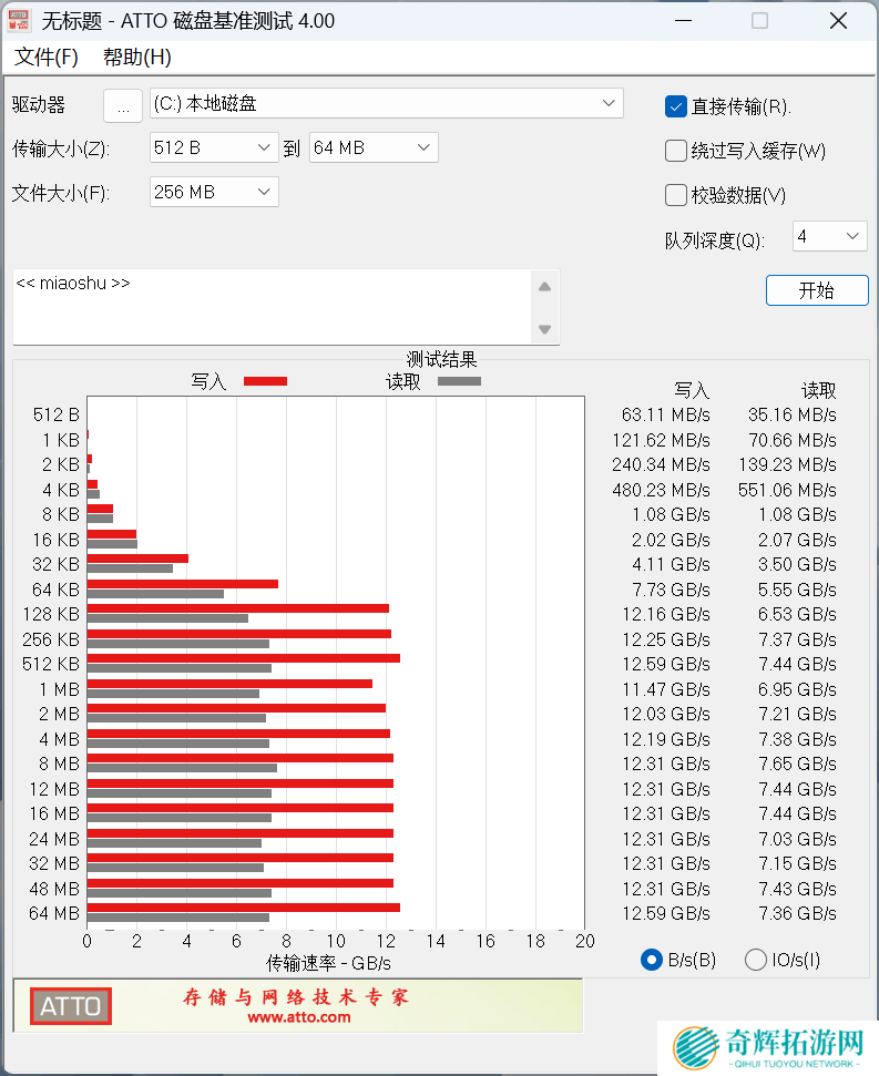 在性能测试中,致态TiPro9000 4TB版本展现出了卓越的性能。在CrystalDiskMark测试中,其顺序读取速度突破了14GB/s,达到了14775MB/s,写入速度也有13962MB/s,4K随机读取和写入速度分别达到了99MB/s和350MB/s。在ATTO Disk Benchmark测试中,从128KB开始,写入速度均稳定超过12GB/s,读取速度稳定在6-7GB/s左右。