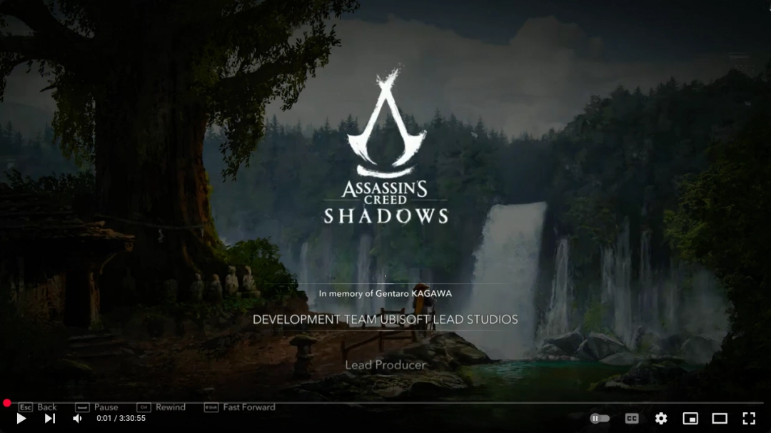 作为参考,统计游戏职员表时间的 Video Game Credits 发布的《刺客信条:影》职员表全程视频长达 3 个半小时。作为参考,该视频制作者的最近其他游戏职员表视频时长分别如下: