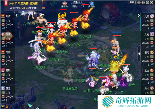 及时行乐方寸不断失心封杀无尽火域的单位,甚至给幻魔蛇加上灵动九天,给红孩儿加上真阳令旗,因为输出太高,无尽火域也只剩苦苦支撑的力气,最终29回合,及时行乐成功清场,拿下2024天启组冠军。