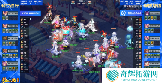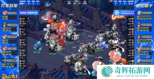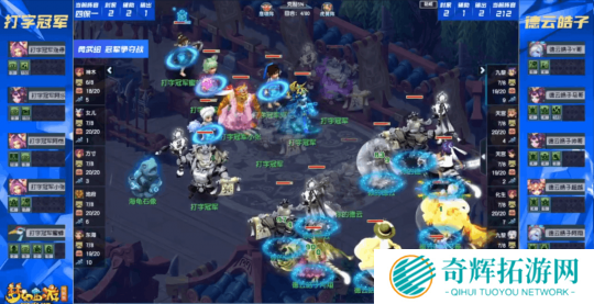 对战方【看图说话】:女儿村、天宫、普陀山、九黎城、九黎城,同样为 “212” 阵容。 在参赛门派方面,双方的选择如出一辙,但在阵法上却大相径庭。