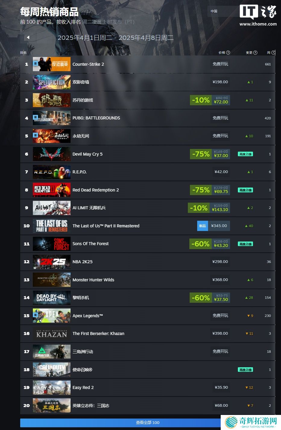 本站 4 月 8 日消息,Valve 刚刚公布了 Steam 最新一周游戏销量排行榜,第一人称模拟游戏《Schedule I》全球二连冠,在线合作恐怖游戏《R.E.P.O.》延续第二名,《云族裔》跌落至第三名。