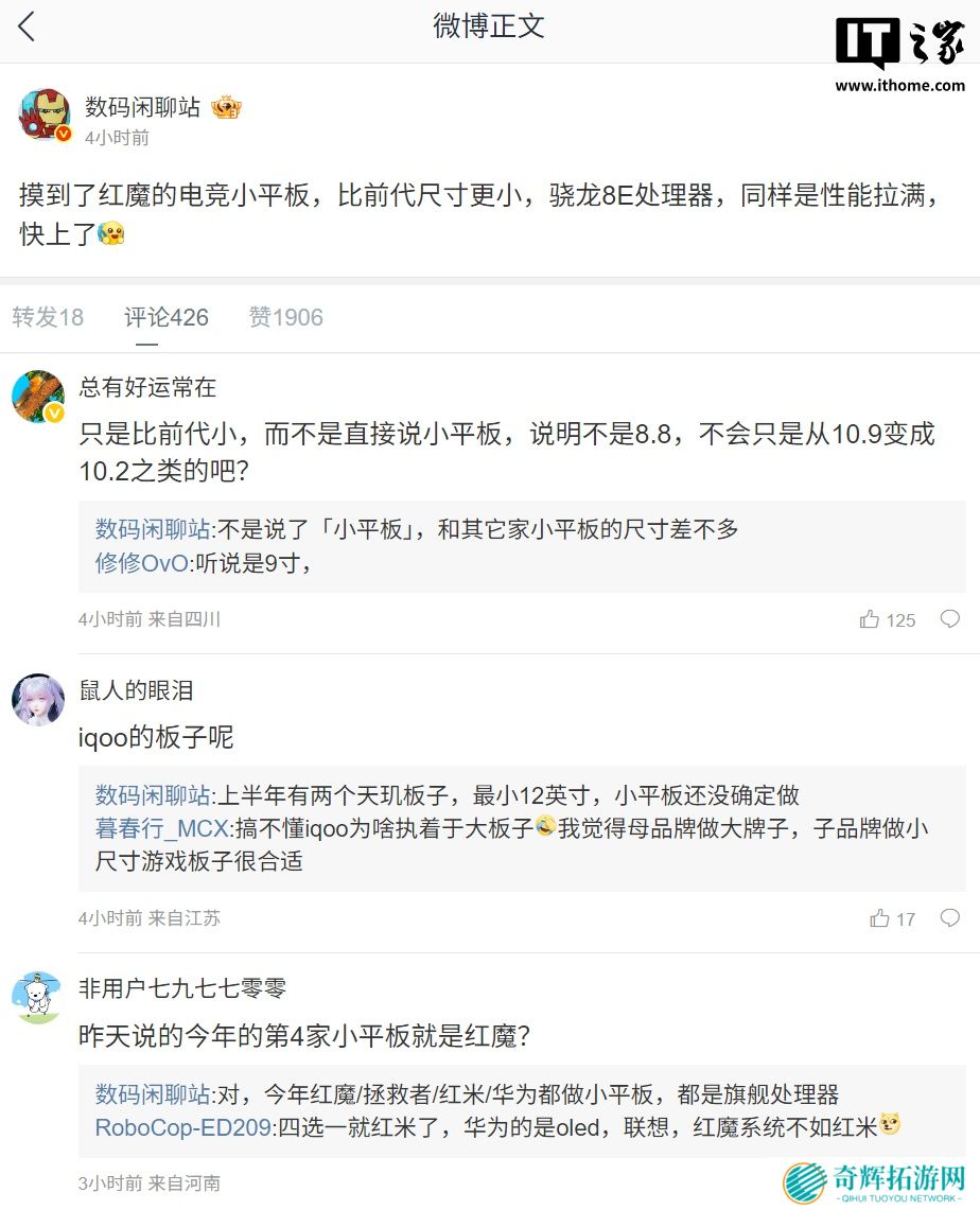 据本站此前报道,有爆料称红魔电竞小平板将搭载骁龙 8 至尊版处理器。今年红魔 / 拯救者 / REDMI / 华为都会推出小平板,且都将搭载旗舰处理器。
