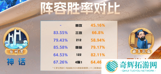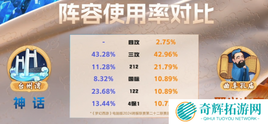 从双方阵容使用率、胜率来看,【神话】帮派的三攻、212、国标队伍胜率较高,【聚义山庄】122队伍的胜率较高,双方4保1队伍胜率差距不大。单从数据情况来看,【聚义山庄】在周五建设环节有一定优势,【神话】帮派周六竞技、周日夺旗环节中略胜一筹。
