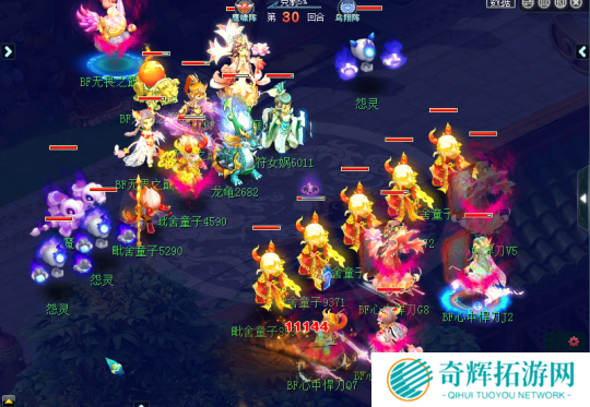 无畏之巅战队心思缜密,知道横扫点杀成功率几乎为零,于是在30回合醍醐掉了被FC必中的地府,3点灵元的剑斩1W1将DT点死。这样对面DF就可以连续使用4点灵元进行延长。