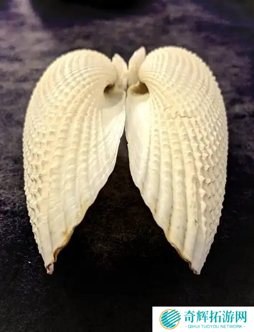 2、它的两片贝壳薄而细长,并且呈非对称排列,壳表面布满了放射状的肋纹,其中靠近壳前端的肋纹更高、更锋利,形状犹如一对展开的羽翼,因此得名。