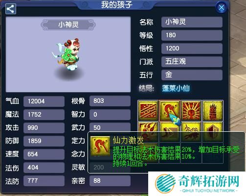除此之外,“蓬莱小仙”结局的孩子也在本次PK中发挥出了巨大作用。其特殊技能“仙力激发”可以提升20%的法术伤害结果,能大幅度提升法系门派的输出能力。而且,全民PK的孩子可以自定义属性和技能,令其具备极强的生存能力和卡速属性,单一输出点几乎拿其毫无办法。