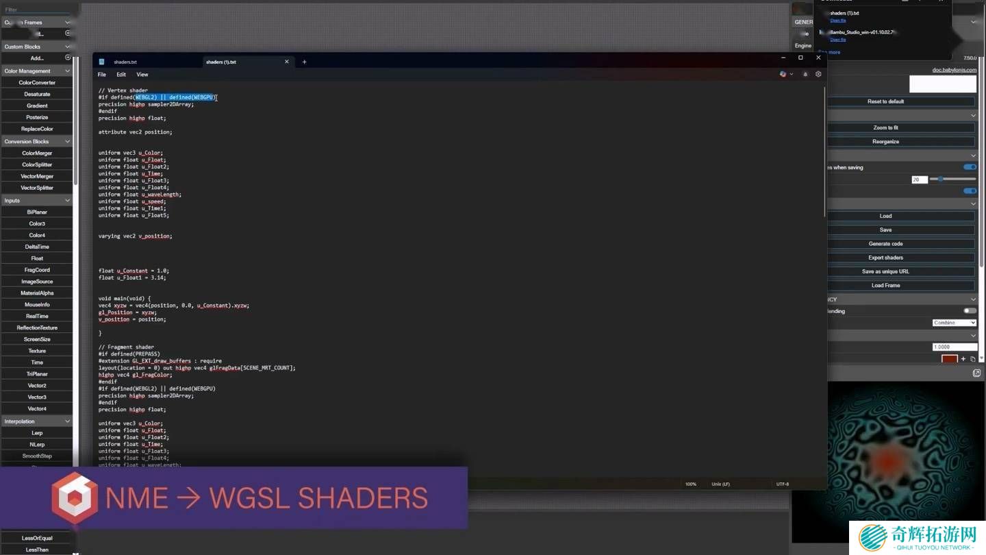 最Babylon.js 8.0原生支持WebGPU,核心着色器已全面迁移至GLSL/WGSL,移除了转换层,使得运行效率大幅提升。同时,该版本还支持自定义WGSL着色器,为开发者提供了更加灵活和高效的图形处理能力。