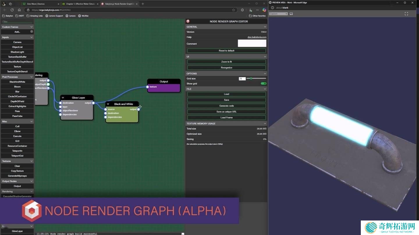 Babylon.js 8.0还引入了Alpha版的Node Render Graph,这一功能为开发者提供了前所未有的渲染管线定制能力。无需编写繁琐的底层代码,开发者即可自由定义渲染流程,灵活调整画面输出,从而大大提升了开发效率和创作自由度。